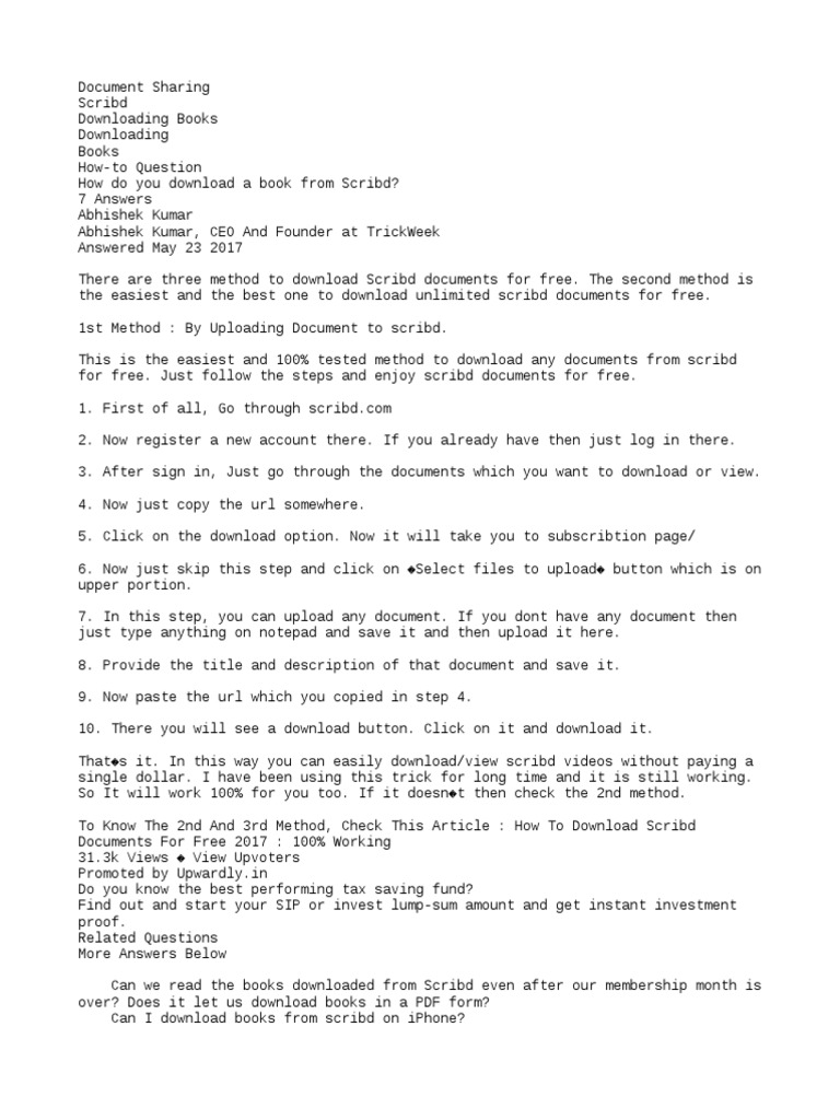 The benefit of downloading scribd documents this way is convenience. Download pdf or doc file from scribd without signup or paid account or premium account. The scribd website is a mobile library that you can take anywhere in your pocket. Our first method for downloading scribd documents on the web relies on uploading a document of your own to a scribd account to gain access to the document you want to download. I know there are a few methods for pulling documents for scribd but was curious as to what works for pulling books from scribd?